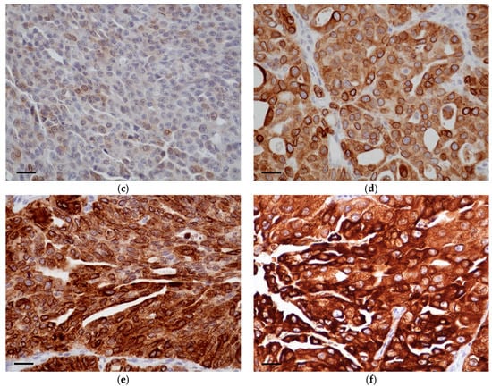 Cyclooxygenase-2 immunohistochemistry. (a) Normal bladder epithelium (E) of a 10-year-old female mongrel. There is no apparent cyclooxygenase-2 expression (COX-2, bar = 25 μm). (b) High-grade transitional cell carcinoma from an 11-year-old female Scottish terrier with an IRS of 7.6. Intensity of cyclooxygenase-2 expression varied from mild (*) to marked (#) within the specimen (COX-2, bar = 100 μm). (c) Area with minimal intensity of cyclooxygenase-2 expression in high-grade transitional cell carcinoma from an 11-year-old castrated female bracke (COX-2, bar = 25 μm). (d) Area with mild intensity of cyclooxygenase-2 expression in low-grade transitional cell carcinoma from a 12-year-old castrated female beagle (COX-2, bar = 25 μm). (e) Area with moderate intensity of cyclooxygenase-2 expression in high-grade transitional cell carcinoma from a 13-year-old castrated male mongrel (COX-2, bar = 25 μm). (f) Area with marked intensity of cyclooxygenase-2 expression in low-grade transitional cell carcinoma from an 11-year-old castrated male podenco (COX-2, bar = 25 μm).