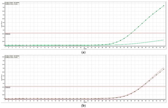 Fluorescent signals detected by the TaqMan® SNP assay of a canine transitional cell carcinoma. (a) In transitional cell carcinoma without BRAF mutation, there is only a signal from the wild-type probe (homozygous thymine, dotted curve) and no signal from the variant probe (curve without dots). (b) In transitional cell carcinoma with BRAF mutation (heterozygous thymine and adenine), signal curves of both the wild-type probe (thymine, dotted curve) and the variant (adenine, curve without dots) can be seen.