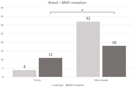 Correlation between breed and the presence or absence of BRAF mutation: BRAF mutation occurs significantly more often in transitional cell carcinoma in terriers than in transitional cell carcinoma in non-terriers (Fisher’s exact test, p ≤ 0.05).