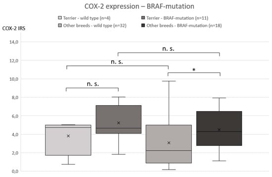 Correlation between the intensity of cyclooxygenase-2 expression and the presence or absence of BRAF mutation: a significant difference in the cyclooxygenase-2 expression was only detected in non-terrier breeds comparing BRAF mutation-positive and -negative transitional cell carcinoma (Mann–Whitney U-test, p ≤ 0.05).
