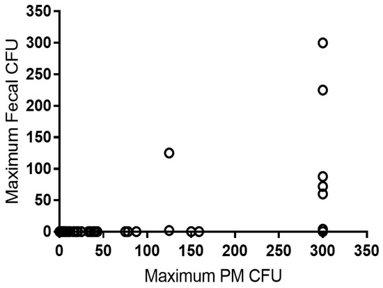 Distribution of colony forming units among samples collected from cows on a single dairy farm. The maximum post-mortem colony forming units (PM CFU) per tube is shown on the X axis and the corresponding maximum lifetime fecal CFU per tube in the same cow is shown on the Y axis.
