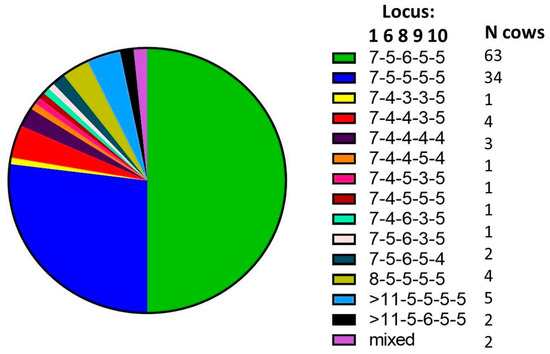 Of the 12 MAP-shedding dam-daughter pairs with MAP SSR type information available (one pair had incomplete SSR typing data), nine shared the same MAP SSR type, and two of these nine daughters also carried an additional MAP SSR type with a repeat difference (RD) of 1 relative to the shared SSR type. In three pairs, daughter SSR types did not match any of the SSR types identified in the dam, in one of these three, an SSR type with an RD of 2 was present in the infected daughter relative to an SSR type in her dam. All dam–daughter pairs with a common MAP SSR type shared one of the two dominant SSR types (see Table 2). The number of dam–daughter pairs infected with 7-5-6-5-5 was significantly higher than expected (8 vs. 3.4, p = 0.02). On the other hand, the number of pairs infected with 7-5-5-5-5 was not significantly different than expected (3 observed vs. 1.2 expected, p = 0.12).