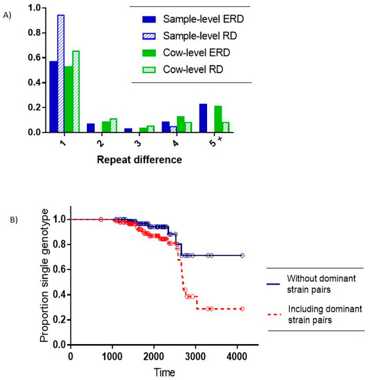 Distinguishing multiple infections from within-host evolution. (A) Juxtaposes the Expected Repeat Difference (ERD) based upon random pairs of single-SSR type samples with the observed Repeat Difference (RD) for within-host pairs with multiple SSR types. Solid bars represent ERD and striped bars represent RD. Sample-level results are presented in blue and cow level results in green. The X axis shows repeat differences of 1, 2, 3, 4, and 5 or more. The Y-axis indicates the proportion of samples. The four samples with ‘mixed’ designation are not included in this figure. (B) Kaplan–Meier plot of time in days to mutation event in animals with at least one SSR type initially detected. The red dashed line includes dominant on-farm SSR pairs, while the solid blue line does not.