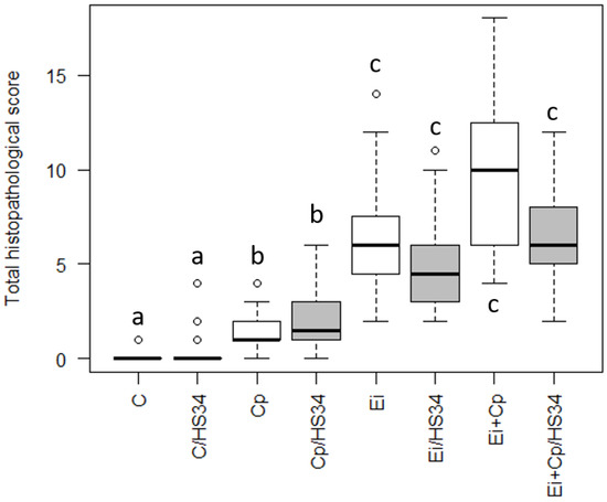 Scores of histopathological lesions in small intestine of broilers. The boxplots represent the median plus the maximum and minimum scores by group. The different letters assigned to each boxplot indicate significant differences for p ≤ 0.05 (Krukal-Wallis test). Control group (C); group infected with Clostridium perfringens (Cp); group infected with Eimeria spp. (Ei); group infected with Clostridium perfringens + Eimeria spp. (Ei + Cp). ‘/HS34’ beside the group name indicates the presence of heat stress.