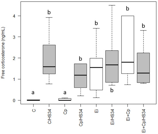 Quantification of serum levels of free corticosterone. The boxplots represent the median plus the maximum and minimum scores by group. The different letters assigned to each boxplot indicate significant differences p ≤ 0.05 (Krukal-Wallis test). Control group (C); group infected with Eimeria spp. (Ei); group infected with Clostridium perfringens (Cp); group infected with Clostridium perfringens + Eimeria spp. (Ei + Cp). ‘/HS34’ beside the group name indicates the presence of heat stress.