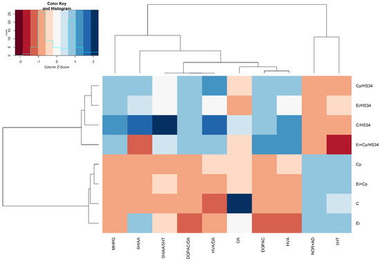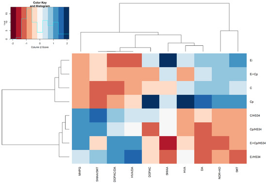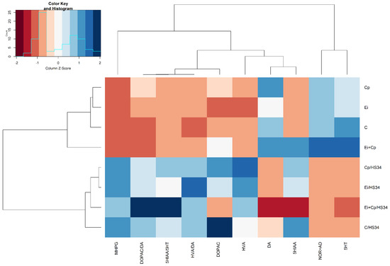 Heat map with the average concentrations of neurotransmitters in the brainstem. The data were normalized to the mean of the control group (C), followed by normalization for each neurotransmitter. Groupings in rows and columns were made to identify similarities between neurotransmitters and were based on the Euclidean distance and complete agglomeration method. The distances are represented by dendrograms in the x- and y-axes. Control group (C); group infected with Eimeria spp. (Ei); group infected with Clostridium perfringens (Cp); group infected with Clostridium perfringens + Eimeria spp. (Ei + Cp). ‘/HS34’ beside the group name indicates the presence of heat stress.