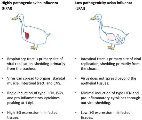 Chickens also mount robust IFN-α responses to HPAI H5N1 infection, within 1 to 2 dpi, but fail to control viral replication and succumb to an apparent cytokine storm [105,106,107]. The key difference between chicken and duck early type I interferon induction, which we propose contributes to this striking difference in outcome, is related to their pattern recognition receptors as discussed in the next section. LPAI infections in chickens, as in ducks, induce lower interferon responses than HPAI infections, in a strain-dependent manner [106,108].