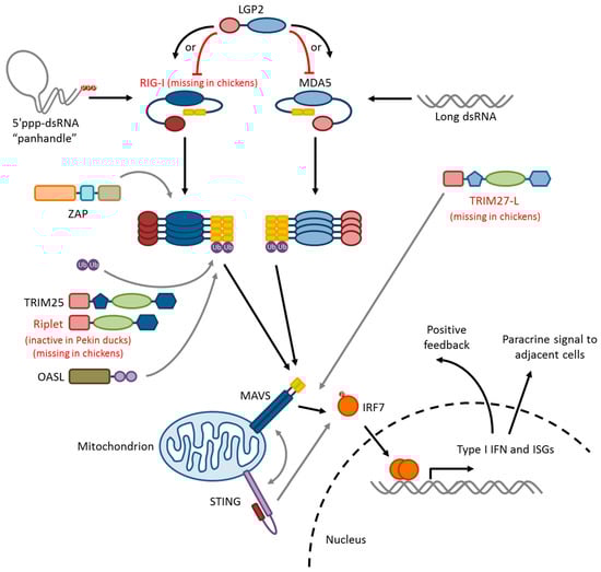 Stimulator of interferon gene (STING) is an adaptor molecule that links intracellular pathogen RNA and DNA detection to NF-κB and IRF activation, and IFN-β production [164,165,166]. Similarly, to mitochondrial MAVS in the RLR pathway, STING resides on the endoplasmic reticulum and mitochondrial outer membrane and activates IRF3/7 in response to foreign nucleic acid detection [164,166,167]. STING directly detects cyclic dinucleotides, which can be of bacterial origin or generated as a secondary signal in response to foreign DNA detection by cyclic GMP–AMP synthase (cGAS) [168,169,170]. Activated STING moves to perinuclear vesicles to initiate a phosphorylation cascade that leads to the nuclear translocation of IRFs [165]. There is significant cross-talk between mammalian RIG-I and STING signaling through several indirect pathways and through a direct interaction between STING and MAVS [167]. In human and mouse cells, RIG-I signaling increases STING expression, which in turn prolongs IFN-β production [171]. Chicken STING overexpression in DF-1 cells activates IRF7 and inhibits influenza virus replication, while knockdown of STING blunts MDA5-mediated IFN-β induction [172]. Duck STING mRNA is present in most tissues and highly transcribed in the stomach, intestine, bursa, liver, and pancreas of 5-day old ducklings, and the blood and pancreas of 2-month-old ducks [173]. Recombinant duck STING localizes to mitochondria and endoplasmic reticulum in DEFs, and induces production of IFN-β and ISGs like Mx and OASL. Knockdown of duck STING blunts IFN-β response to poly(I:C) (a viral RNA mimic) in DEFs. Thus, both duck and chicken STING induce type I interferon directly and potentiate RLR signaling, through MDA5 in chickens, and presumably through RIG-I and MDA5 in ducks.