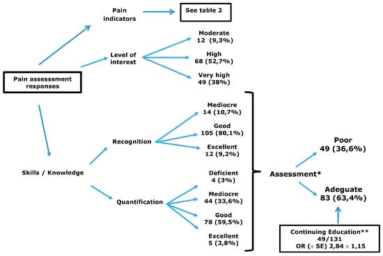 A diagram showing the responses for pain assessment is shown in Figure 1. The level of concern over pain recognition and management was high in the majority of the interviewed veterinarians, with only 12 (9.3%) showing moderate interest. Most veterinarians felt their skills in recognizing pain were better than quantifying the degree of pain. When considering only good and excellent skills for either ability as a perceived competence of proper pain assessment, only 83/131 (63.4%, CI 0.55–0.72) were deemed to have satisfactory skills on pain evaluation, with the rest (49/131, 36.6%) considered to be deficient (Figure 1). No association was found between gender and pain assessment (χ2 = 0.096, p = 0.7). Similarly, there was no association between years in practice (χ2 = 1.23, p = 0.5) or postgraduate degrees attained (χ2 = 0.0, p = 0.99) with pain assessment. However, 49/131 (37.4%) veterinarians had participated in some type of continuing education program (i.e., seminars, conferences, webinars), and were more confident assessing pain, with an odds ratio of 2.84 (p = 0.01, 95% CI 1.27–6.32) for adequate pain evaluation. In addition, the odds of veterinarians using pain scales was 4.28 ± 2.17 (p = 0.004, CI 1.58–11.55) greater if they had also participated in continuing education programs.