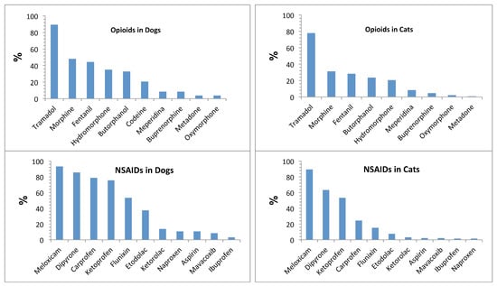 For opioids, as for NSAIDs, the percentage of users in dogs was higher than in cats for most drugs cited, but the frequency order of drugs chosen was similar in both species (Figure 2). Tramadol was the most popular drug prescribed by ≥80% veterinarians, and this was followed by morphine, fentanyl, hydromorphone, and butorphanol. The least used opioids were buprenorphine, meperidine, methadone and oxymorphone.