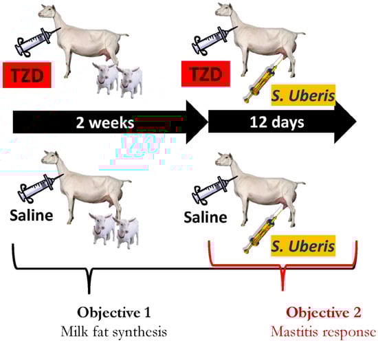 Experimental design. Twelve Saanen dairy goats were randomly assigned to receive a daily injection of 8 mg/kg BW of 2,4-thiazolidinedione (TZD) in 10 mL saline or only saline (n = 6/treatment) for 26 days. Kids (2 per goat) were kept nursing the goats for the first 10 days of the experiment. After 2 weeks of treatment the goats received an intramammary infusion of 7 × 108 cfu of Strep. uberis in the right half of the mammary gland. All the TZD and three CTR goats were euthanized at the end of the experiment. The whole experiment was used to generate data for Objective 1 (present manuscript) and for Objective 2 in the companion manuscript [].
