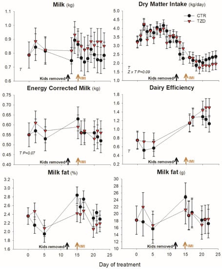Milk yield (kg produced by the left mammary gland in the AM milking), energy corrected milk, dairy efficiency, daily dry matter intake, milk fat and milk yield (produced by the left mammary gland in the AM milking) in goats receiving daily intra-jugular injection of 2,4-thiazolidinedione (TZD) or saline (CTR). Arrows indicate the time of kid removal and intramammary infusion of Strep. uberis in the right half of the mammary gland (IMI). Letters in the graph denote significant (p < 0.05) effects of time (T), treatment (Z), and interactions (Z × T). The reported p-value is for tendencies. Error bars denote SEM.