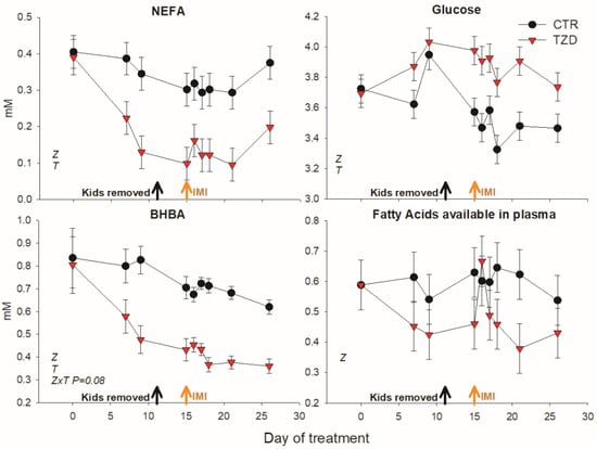 Non-esterified fatty acids (NEFA), glucose, β-hydroxybutyrate (BHBA), and estimated fatty acids present in plasma (mM NEFA + 3× mM TAG) in goats receiving daily intra-jugular injection of 2,4-thiazolidinedione (TZD) or saline (CTR). Arrows indicate removal of kids and time of intramammary infusion of Strep. uberis in the right half of the mammary gland (IMI). Letters in the graph (a,b) denote significant effects of time (T), treatment (Z), and interactions (Z × T). The reported p-value is for tendencies. Error bars denote SEM.