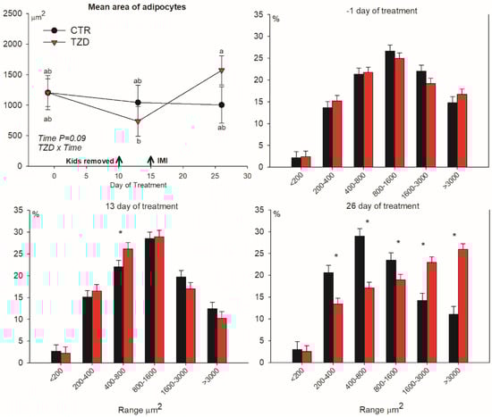Adipocyte area was affected by treatment × time (Figure 4). 2,4-TZD treatment had a significant increase in the median area of adipocytes from Day 13 to Day 26 of treatment, while no changes were detected for the CTR goats. The effect was due to an increased frequency of large adipocytes in TZD vs. CTR goats, whereas the frequency of small-to-medium-sized adipocytes decreased (Figure 4).