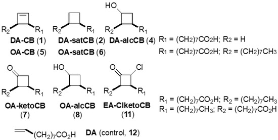 | 5 | OA-CB | 1-(Octanoic acid-8-yl)-2-octylcyclobutene | 308.5 | cis-C18, alkene |