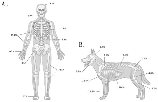 Anatomic distribution of osteosarcoma in humans (A) and in dogs (B). Numbers indicate the percentage of cases at each anatomic site out of all osteosarcomas in adolescent humans (<24 years old; n = 1855) [], and the mean percentage at each anatomic site compiled from five canine studies (n = 1346) [,,,,]. Only the most common skeletal sites are included; therefore, percentages do not add up to 100%.
