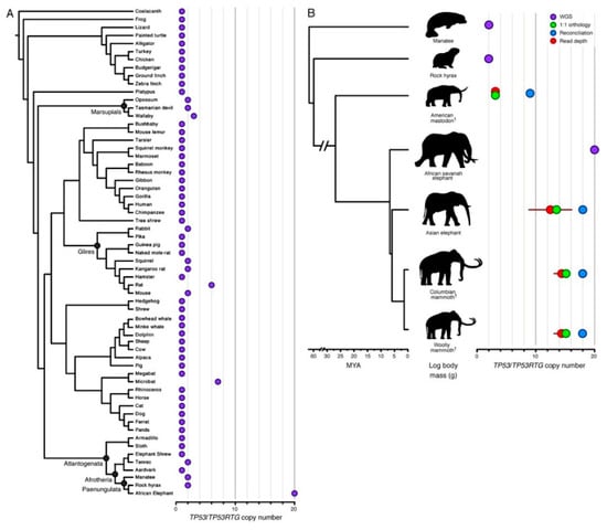 Expansion of the TP53RTG gene repertoire in Proboscideans. (A) TP53 copy number in 61 Sarcopterygian (Lobe-finned fish) genomes. Clade names are shown for lineages in which the genome encodes more than one TP53 gene or pseudogene. (B) Estimated TP53/TP53RTG copy number inferred from complete genome sequencing data (WGS, purple), 1:1 orthology (green), gene tree reconciliation (blue), and normalized read depth from genome sequencing data (red). Whiskers on normalized read depth copy number estimates show the 95% confidence interval of the estimate. Reproduced with permission from “TP53 copy number expansion is associated with the evolution of increased body size and an enhanced DNA damage response in elephants”, Sulak et al., 2016. https://doi.org/10.7554/eLife.11994.004.