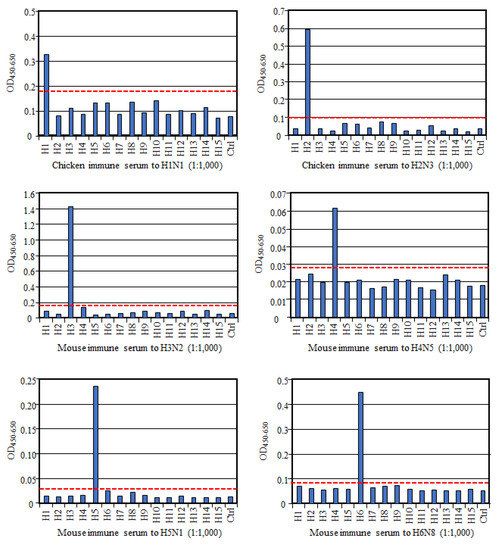 Validation of the multi-hemagglutinin (HA)-ELISA. Specificity of the assay was evaluated using chicken or mouse antisera to each HA subtype. With each antiserum (diluted at 1:500–1:5000), the optical density (OD)450–650 values to H1–H15 and control antigens are shown. The red dotted line indicates the cut-off value, which is the mean OD value plus three times the standard deviation (SD) with the other 15 antigens comprising 14 HA subtypes and a control. Representative results from multiple experiments are shown in the figure.