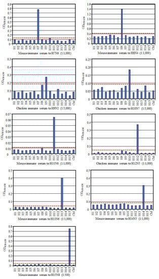 To evaluate if HA-ELISA could detect an HA subtype-specific antibody, we prepared antisera to each HA subtype and examined their reactivities in this assay. As shown in Figure 1, all these reference antisera, except anti-H9 serum, reacted only to the homologous HA subtype, much more than to all the other heterologous HA subtypes and the control antigen, indicating no or very low cross-reactivity between HA subtypes. Exceptionally, antisera to the H9 subtype reacted not only to the homologous H9 antigen but also to the H8 subtype antigen albeit weakly, suggesting cross-reactivity between these two HA subtypes. However, according to the cut-off value we proposed here, the OD value with H8 antigen was judged as a negative result. Collectively, these data authenticate reaction specificity of our HA-ELISA to any HA subtype.