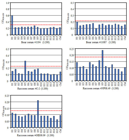 Confirmation of the specificity of the multi-HA-ELISA using wild animal samples. Boar serum #1194 and #11087 were viral neutralizing (VN) positive to H1N1 in the VN test. Raccoon serum #C-251 were VN positive to the H5N1 virus. Raccoon sera #NP08.49 and #OIW08.09 were VN positive to the H9N2 virus. The red dotted line indicates the cut-off value. Representative results from multiple experiments are shown in the figure.