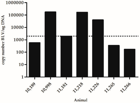 BLV induces a life-long persistent infection in cattle, with permanent antibody response, where the majority of infected cattle remains asymptomatic. Since in most of the infected animals, BLV DNA is detected in peripheral blood as a provirus, blood PVL is the only virological marker available for disease monitoring during BLV infection. The presence of BLV-infected animals with high PVL are dangerous for a dairy herd because a high level of BLV infection is associated with a greater transmission probability [21,22]. In the present study, animals with high PVL at the start point of the study (10,998–11,218–11,226) might have a higher potential risk of BLV transmission due to the intermittent evidence of BLV transcripts in blood samples, particularly around delivery. This finding was also observed in human T-lymphotropic virus (HTLV) infection where patients with high PVL have a greater risk of developing myelopathy (HAM/TSP) or adult T-cell leukemia/lymphoma (ATLL) and of transmitting HTLV horizontally by milk [23].