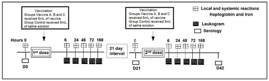 The heifers were evaluated for adverse effects, serum haptoglobin (Hp) and iron concentrations at (0 h) and after vaccination at 6, 24, 48, 72, and 168 h. A complete leukogram, including: Total leukocytes, lymphocytes, monocytes, basophils, neutrophils, eosinophils and platelets was performed after vaccination at 6, 24, 48, 72, and 168 h (Figure 1). Specific neutralizing antibodies against BVDV and BHV-1 were measured at the day (D) of vaccination day 0 (D0), at booster day 21 (D21) and 42 days post vaccination (D42). The interval between the first and second dose of vaccine was 21 days.