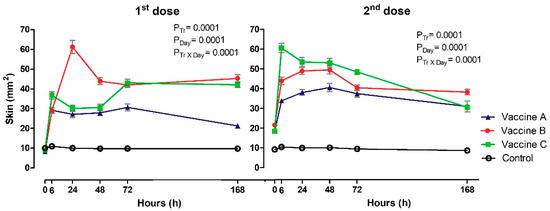 The heat variable showed differences between the groups at 6 h (p = 0.019), 24 h (p = 0.001), 48 h (p = 0.035) and 72 h (p = 0.012) after the first dose, with a higher heat-positive frequency of heifers in Vaccines B and C compared to Vaccine A and Control groups (Table A1). It was not possible to detect differences between treatments after booster. Cochran’s test showed variations in Vaccines A, B and C groups after first and second doses of vaccines, with higher localized heat reactions after the first dose at 24 h for Vaccine C, 48 h for Vaccine B and later at 72 h in the Vaccine B group. Following the second dose, higher localized temperature was observed in most heifers vaccinated with Vaccine C (6 h), Vaccine A (24 h) and Vaccine B (48 h). The McNemar post hoc test revealed no differences for any of the experimental groups (p ≥ 0.008). No animals exhibited rubor (redness) (data not shown). The skin thickness increased following vaccination in the vaccinated heifers (Figure 2). Differences were observed between groups and day and it was possible to detect interaction Tr x Day after the first and second doses of vaccines (p ≤ 0.05). Skin measurements allowed identification of volume increase at point of application in all heifers vaccinated in relation to control group, after application of first dose between 6 h and 168 h. Maximum increase in skin thickness was observed for Vaccine B (p = 0.0001) at 24 h (61 mm2), compared to Vaccine A (27 mm2) and Vaccine C (30 mm2) after the first dose. In contrast, for the second dose of vaccine, there was an increase in skin thickness for Vaccine C (p = 0.0001; 61 mm2) compared to Vaccine A (34 mm2) and Vaccine B (44 mm2). The skin thickness of heifers control group was significantly less (ranged from 9 to 11mm2) than vaccinated heifers at 6h after the first dose and then at all times after the second dose.