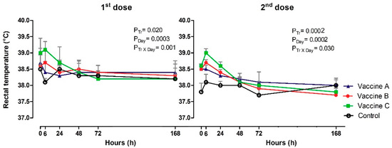 Variables were tested for fixed effects of treatments (PTr; Vaccines A, B, C and Control) and days (PDay; 0, 6, 24, 48, 72 and 168 h), as well as the interaction of treatment and day (PTrxDay; effects by a MIXED procedure (PROC-mixed, SAS), with least significant difference (LSD) post hoc test. The models were tested according to covariance structures, using Akaike information criterion (AIC). Differences were considered significant when p ≤ 0.05.