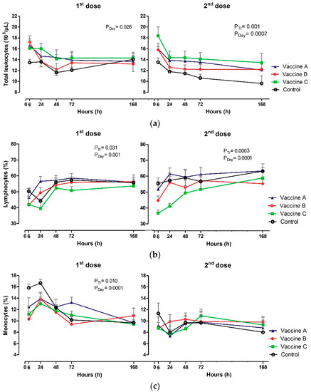 Relative values were influenced only after the first vaccination, control heifers presented higher values of monocytes at 6 h and 24 h in relation to vaccinated groups (p = 0.010). The control heifers, Vaccine B and Vaccine C had a gradual decrease in monocyte count up to 168 h (p = 0.0001) (Figure 4c). Absolute numbers of monocytes differed only in relation to the effect of the day after the first vaccination (p = 0.0002), higher values were observed in the Vaccine A group at 24 h (1.99 × 103/µL).