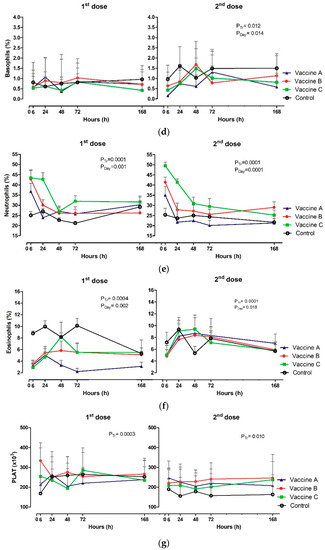 The profile of leukograms and platelet counts are shown in Table A3 and Table A4; Figure 4a–g. The WBC (×103/µL) had no treatment effect or Tr x day interaction after the first dose of the vaccine (p ≥ 0.050) (Figure 4a). On the other hand, the effect of day on the number of total leukocytes (p = 0.026) was detected, with a decrease in WBC in Vaccine B group between 6 h and 168 h. Regarding the second dose, only the treatment effect (p = 0.001) and the day (p = 0.0002) were observed. The maximum number of WBC was observed at 6 h in vaccinated and control groups, with a gradual decrease in subsequent moments. WBC number was higher in Vaccine C and lower in control group at 6 h and 168 h after the vaccination protocols.