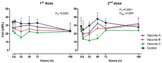 Iron concentrations (µM/L) are shown in Table A3 and Figure 5. Before vaccinations, iron serum concentrations were the same across the time intervals and groups (0h), but between 6 h and 72 h the values were lower in the vaccinated groups than in the control group (p = 0.0002; p = 0.001). The time analysis revealed small oscillations in the iron content for control group, observing the lowest value at 6 h and the highest at 48 h after booster (p = 0.0001). The group immunized with Vaccine C showed a significant decrease (p = 0.0001) in serum iron levels between 6 h and 48 h, with a slight increase in the subsequent time intervals of 72 h and 168 h.