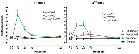 Serum Hp (mg/dL) did vary by vaccination after the first and second doses in the effect of treatment (p = 0.0001; p = 0.0001), day (p = 0.0001; p = 0.0001) and Tr x Day (p = 0.0001; p = 0.007). Significant differences were observed between experimental groups after 24 h at first dose. Vaccine C group had high concentrations of Hp (7.87 mg/dL), compared to Vaccine A (1.06 mg/dL), Vaccine B (1.34 mg/dL) or the control group (1.80 mg/dL). Subsequently, there was an increase at 48 h for Vaccine C (3.71 mg/dL). At subsequent time points, no differences were observed between vaccines, although serum Hp levels in Vaccine C group were still visually higher than those in other experimental groups (Figure 6). The profile of Hp after booster was very similar to first vaccination, with higher concentrations in Vaccine C group at 24 h (4.67 mg/dL) and 48 h (5.01 mg/dL), compared with other vaccines and the control. Difference between time intervals were observed only in Vaccine B or Vaccine C groups, with maximum values at 6 h (2.63 mg/dL) and 72h (2.39 mg/dL), 24 h (4.67 mg/dL) and 48 h (5.01 mg/dL).