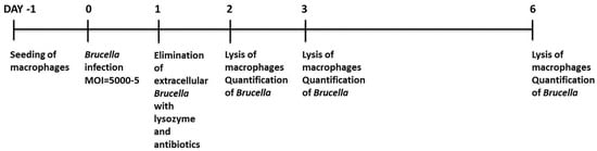 Fifty thousand ovine macrophages were seeded in 24-well tissue culture plates at a final volume of 1 mL (Day −1). 24 h later (Day 0), the cells were counted by trypan blue exclusion, washed with phosphate-buffered saline (PBS) (Lonza, Basel, Switzerland), and exposed to Brucella at an MOI of 5000, 500, 50, or 5. The macrophage-specific medium (Macrophage-SFM, Invitrogen, Carlsbad, CA, USA, supplemented with heat-inactivated fetal bovine serum, Invitrogen, Carlsbad, CA, USA) used for the duration of the whole cell culture, did not contain any antibiotics at this point. The next day (Day 1), cells were washed with PBS and cultivated in macrophage-specific culture medium supplemented with 5% penicillin/streptomycin (Invitrogen, Carlsbad, CA, USA) and 0.5 mg/mL lysozyme (Roche, Basel, Switzerland) to kill extracellular bacteria overnight. At the next day of the procedure (Day 2), cells were either washed with PBS to remove lysozyme, counted, and left in culture up to 4 more days (Day 3 or Day 6) in the macrophage-specific culture medium, or washed with PBS, detached from the culture plates with 0.05% trypsin-EDTA (Invitrogen, Carlsbad, CA, USA) and pelleted at 1400 rpm for 10 min, to exclude precipitating any extracellular brucellae that may had survived exposure to antibiotics and lysozyme. The pellets were resuspended in PBS and underwent 3 freezing-thawing cycles. Before DNA extraction, all samples were additionally incubated with 0.25 mg/mL lysozyme for 1 h at 37 °C. Quantification of internalized brucellae was conducted with quantitative Real-time PCR and CFU assay. Uninfected cells served as control at all times. Viability of macrophages was maintained by changing the cell culture medium and assessed by trypan blue exclusion at all time points of the experimental procedure. Especially for the time gap between Days 3 and 6, the wells were supplemented with the appropriate fresh medium volume in order to maintain the culture supernatant at 1 mL. The study is graphically outlined in Figure 1.