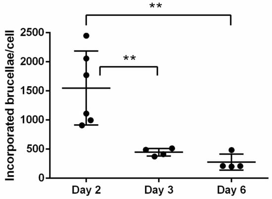 Furthermore, we proceeded to culturing the Brucella-infected macrophages for up to 6 days, in order to evaluate any potential fluctuations in the number of incorporated brucellae over time, under conditions of heavy bacterial loads produced by the MOI of 5000. Summative analysis of experiments conducted with Brucella-infected macrophages at MOI = 5000, demonstrated a gradual drop in the bacterial load associated with duration in culture; from Day 2 to Day 6 post-Brucella infection, bacterial numbers were significantly reduced (Day 2: 1549.32 ± 635.85 vs. Day 6: 276.67 ± 138.01, p = 0.0013, one-way ANOVA) (Figure 5). This is consistent with a previous report with B. abortus in an infected macrophage cell line stating that the number of intracellular brucellae usually peaks at 48 h post-infection and until 96 h the load is gradually dropping []. This may be a result of natural intracellular killing of brucellae until they reach residual numbers [] that basically persist for life, and not of macrophage death, since viability of cells, measured by trypan blue exclusion at all time points, remained >90%. The high variation in incorporated Brucella numbers on Day 2 most likely reflects each animal’s sensitivity to infection.