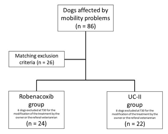 At the first consultation and clinical screening the subjects with mobility problems were 86 and 26 dogs have been excluded because of matched exclusion criteria. Sixty subjects were included in the study: 30 in the R group and 30 in the UC-II group (Figure 1). In six dogs of the R group and eight of the UC-II group, a follow-up was not available because the owner or the referral veterinarian decided to discontinue or modify the treatment. In none of these cases adverse effects were reported to us. A total of 46 dogs completed the study: 24 belonging to the R group and 22 to UC-II group.