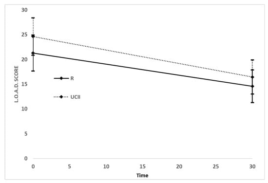 Based on the data obtained from the owner evaluation, a significant reduction in LOAD and MOBILITY scores was recorded between T0 and T30 with a similar magnitude among the two groups (Figure 2): R changes from T0 21.29 (95% CI 18.52 to 24.06) to T30 14.58 (95% CI 11.65 to 17.51) and UC-II changes from T0 24.63 (95% CI 19.84 to 29.42) to T30 16.45 (95% CI 12.47 to 19.88). There was not a statistically significant difference between treatments (F = 1.27, p = 0.2665), nor for the interaction time and treatment (F = 0.67, p = 0.4163). There was, instead, a significant effect for time (F = 68.77, p < 0.0001). Briefly, both drugs were effective on the LOAD score, that decreased from T0 to T30 in both groups.
