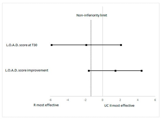 Plot of the 90% confidence limits of the difference in LOAD score at T30 and of improvement in LOAD score between R and UCII groups. The vertical dashed line is the non-inferiority limit.