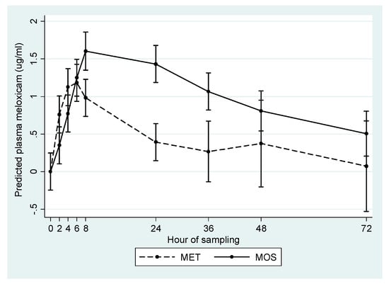 The predicted concentration-time profile of MET and MOS groups, after controlling for parity and repeated measures over time, is presented in Figure 1. Additionally, calculated pharmacokinetic parameters for study animals are presented in Table 2. Overall, plasma meloxicam levels were higher and lasted for a longer period in the MOS group relative to the MET group.