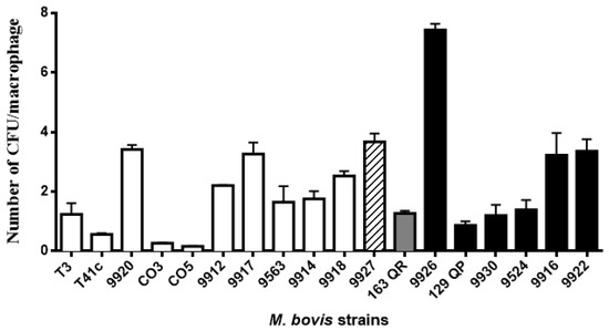 The macrophages derived from peripheral blood have been use as a key of innate immunity to tuberculosis and a phenotypic marker of cattle susceptibility to M. bovis infection. Macrophages from different animals had differential intracellular control of M. bovis strains, depending on virulence. Our previous study showed differences in the bacterial survival rate of 65% and 100% for the avirulent M. bovis BCG and the virulent field isolate known as “El Paso”, respectively [9,10]. Macrophages from animals that better control bacterial replication were found to produce a higher oxidative burst, having greater bacteriostatic activity, producing higher concentrations of nitric oxide, and having a higher pro-inflammatory cytokine gene expression [11,12,13]. Results from our laboratory demonstrated that the M. bovis strain virulence classification obtained by a well-characterized mouse model of progressive pulmonary tuberculosis [14] was also replicable in the bovine macrophage in vitro model. Virulent strains had higher intracellular growth than the attenuated ones [15]. Therefore, bacterial intracellular survival and replication in an in vitro macrophage infection assay may be considered as a correlate of virulence [8,16,17].