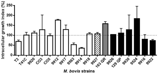 M. bovis intracellular survival/replication rates showed a high degree of variation among strains. Macrophage monolayers were infected with M. bovis at a multiplicity of infection (MOI) ratio of 10:1 for 4 h; this was considered time 0 h. The cells were harvested at 0 h and 24 h post-infection for analysis. Bacterial growth was calculated as the ratio of the total number of intracellular bacteria at the end of the assay to the total number of bacteria at the start the assay, expressed as percentage. Results are the average of three independent experiments, each one with three internal replicates. Statistical analysis was performed using Tukey’s test. A p value of 0.05 or less was considered statistically significant. The color pattern of each bar indicates the group to which it belongs.