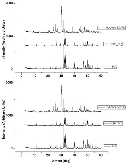 X-ray diffraction pattern of pure hydroxyapatite (HA), magnesium-doped hydroxyapatite (HA_Mg), hydroxyapatite/wollastonite composite (HA/WS) ceramic scaffold. X-ray diffraction pattern of pure hydroxyapatite (HA) ceramic scaffold has been reported for comparison.
