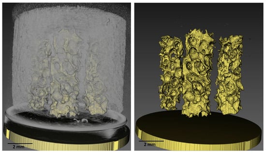The microCT analysis performed on the Honey configuration (Figure 4) allowed checking the correct positioning of the ceramic pillars and the whole porous structure of the substitute.