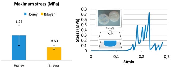 The compression tests were performed using a mechanical analyzer (Lloyd LR5K instrument, AMETEK Test & Calibration Instruments, Bognor Regis, UK) and five samples, both Bi-layer and Honey, compressed at a crosshead speed of 0.5 mm/min and the maximum stress calculated. For each experimental group, means were assessed by descriptive statistics. Each experimental group was compared with the control group (CTRL) and standard Student’s t-test was performed. Statistical significance was defined as a p-value of <0.05.
