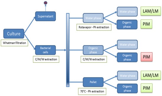 Finally, the remaining lower organic phase pellet was dried under a stream of nitrogen gas and extracted twice with 5 mL of phenol (Merck) and 5 mL of water (Merck) for 30 min at 70 °C under constant stirring. The phenol: water extract was cooled and centrifuged at 750 g for 30 min. Following the centrifugation the mixture was biphasic and the aqueous and phenol fractions were collected in separate tubes. The aqueous phase was washed four times with phenol (Merck) and yielded a water-soluble LAM/LM fraction. The organic phase was washed four times with phosphate buffered saline solution (PBS) and yielded water-soluble PIM fractions.