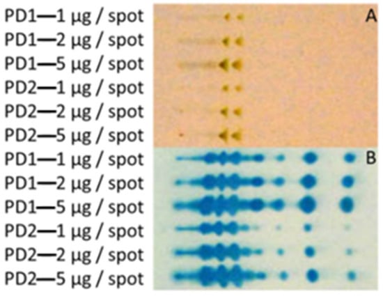 (Immune) TLC of different phosphatidylinositol mannosides (PIM) enriched water-soluble fractions derived from Mycobacterium bovis (MB) AN5. PD1 samples were isolated from shaken cultures, PD2 were extracted from stationary pellicles. Totals of 1, 2 and 5 µg were spotted of each sample. Anisaldehyde staining (A) and immune TLC using MB infected cattle serum as primary antibody (B) were used for visualization. Samples were spotted on the left side of the TLC.