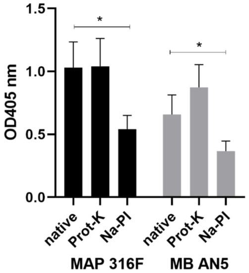 The PIM preparations from MAP 316F and MB AN5, which were both treated with Prot-K and Na-PI, were analyzed using ELISA with 16 different sera. The blank corrected OD405 data were analyzed using a paired Student t-test between the native PIM and the Prot-K treated PIM, as well as the native PIM and the Na-PI treated PIM. Level of significance was set at p < 0.05 (Figure 4).