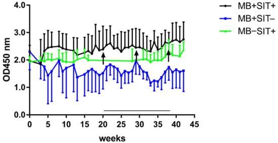 Experimental MB infection and SIT did not significantly alter antibody responses against PIM in cattle. Serum of MB infected cattle was examined with PIM ELISA. The study consisted of three groups of calves, aged 6 months at the start of the experiment. Calves in group MB + SIT + (n = 5) and MB + SIT − (n = 4) were experimentally infected with MB through IV injection of 1 mg of MB strain AN5. Group MB − SIT − (n = 5) served as uninfected controls. Groups MB + SIT+ and MB − SIT + were skin tested with a single intradermal test (SIT) (3000 IU PPD-B) at days 20, 32, and 40 post infection (MB + SIT +) or at the start of the experiment (MB − SIT +). Arrows point at days of SIT tests in group MB + SIT +. Data are expressed as the group mean background corrected optical density. Error bars represent the SEM.
