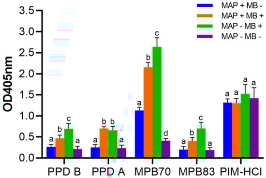Serological responses to PIM antigens in comparison to reactions against PPD-A and PPD-B tuberculin, and the MB MPB70 and MPB83 E. coli recombinant proteins. Sera were tested from four different groups of adult cattle defined by infection status (group 6–9 in Table 1). Blue: MAP positive and MB negative animals (MAP + MB −), n = 254. Orange: MAP positive and MB positive animals (MAP + MB +), n = 147. Green: MAP negative and MB positive (MAP − MB +), n = 69 animals. Purple: MAP negative and MB negative animals (MAP − MB −), n = 30 animals. Data are expressed as the group mean background corrected optical density. Error bars represent the SEM. Data were analyzed using ANOVA at antigen level. Different letters indicate a significant difference between conditions (p < 0.05).