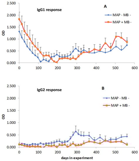 IgG1 and IgG2 isotype distribution of PIM specific antibodies was similar between MAP infected and control animals, with a strong bias towards IgG1 responses. Sera obtained from calves sourced from a certified MB free farm experimentally infected with MAP during the first month of life (MAP + MB −) were used for a PIM ELISA. As controls, blood samples from 10 calves from certified MB and MAP unsuspected (MAP − MB −) herds were taken monthly starting in the first week of life for a period of 18 months as part of a larger longitudinal follow-up study. The presence of PIM specific IgG1 (A) and IgG2 (B) antibodies was tested. Results are expressed as the group mean background corrected optical density. Error bars represent the SEM.