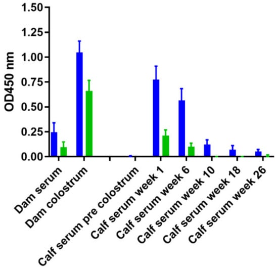 When stated, the PIM specific ELISA was expanded to an absorbed ELISA using the provided pre-absorption buffer described above. Colostrum and sera were incubated with the commercially available pre-absorption buffer (ID-Vet) according to the provided manufacturer’s instructions. Subsequently, the colostrum and sera were tested in the PIM ELISA at dilutions similar to the original PIM ELISA.